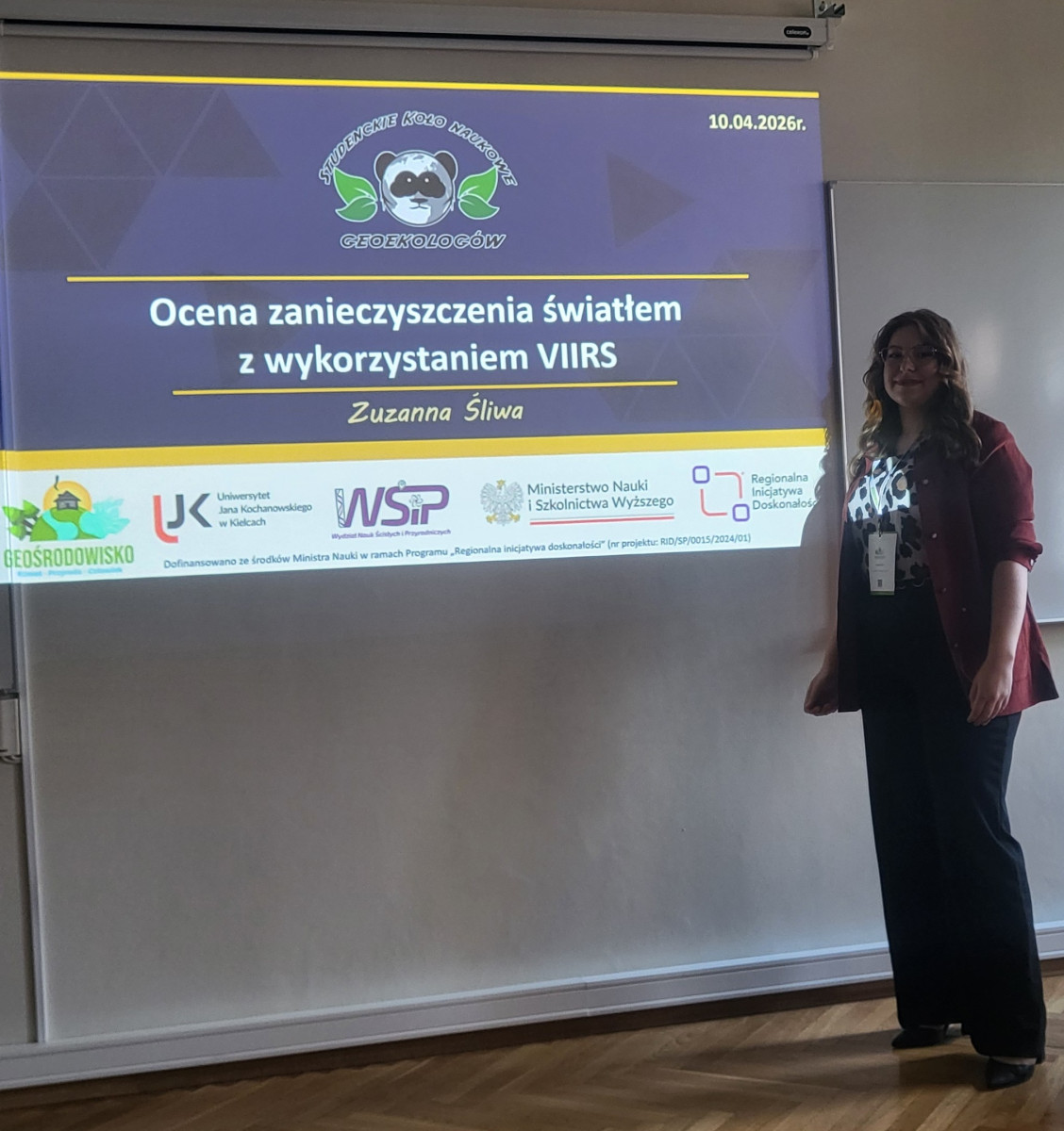 Zwycięska praca dotyczyła oceny przestrzennego zróżnicowania zanieczyszczenia światłem na terenie miasta Kielce z wykorzystaniem danych satelitarnych VIIRS oraz narzędzi GIS. Autorka wskazała obszary o podwyższonej emisji światła oraz podkreśliła znaczenie analiz przestrzennych w badaniach nad tym zjawiskiem, wpisując swoją tematykę w aktualne wyzwania związane z ochroną środowiska i zrównoważonym zarządzaniem przestrzenią miejską.