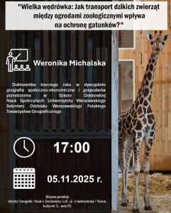 Oddział Kielecki Polskiego Towarzystwa Geograficznego oraz Instytut Geografii i Nauk o Środowisku Uniwersytetu Jana Kochanowskiego w Kielcach zapraszają na spotkanie, które odbędzie się w środę 5 listopada o godz. 17:00. W programie prelekcja Weroniki Michalskiej pt.: „Wielka wędrówka: Jak transport dzikich zwierząt między ogrodami zoologicznymi wpływa na ochronę gatunków?” Wystąpienie poświęcone będzie roli transportów dzikich […]